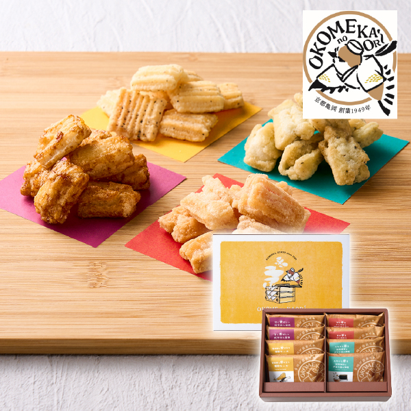 | 内容 | 手揚げ京あられ×8袋(旨み香る干し海老と伊豆大島の海塩14g・甘く香ばしい炊き出し醤油15g・ふわりと香る国産海苔と伊豆大島の海塩15g・黒胡椒と香り立つ燻製チーズ12g×各2袋) |