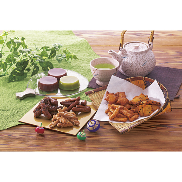 | 内容 | かりんとう(蜂蜜黒糖・落花生)40g・羊かん(抹茶・練り・小倉)60g×各1、あられ(海老・海苔・味噌)12g×各2 |