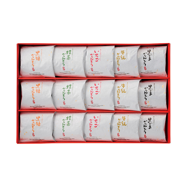 | 内容 | 黒糖かりん糖(10g)・黒胡麻かりん糖(10g)・牛乳かりん糖(10g)・抹茶かりん糖(10g)・いちごかりん糖(10g)×各3 |