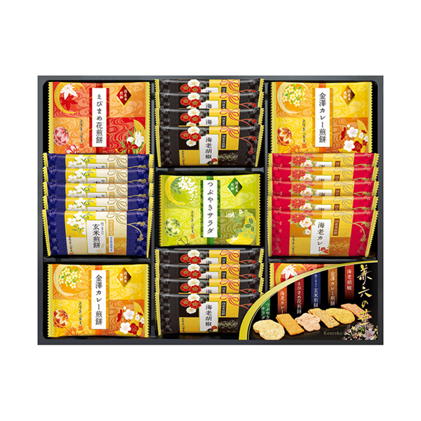 | 内容 | 金澤カレー煎餅・えびまめ花煎餅・海老胡椒煎餅×各8、黒ごま入り玄米煎餅・海老カレー煎餅×各5、つぶやきサラダ煎餅×4 |