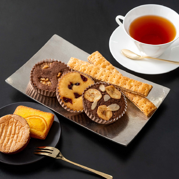 しっとり生地にフルーツやナッツを飾ったプチケーキやオレンジケーキ、さくっとした食感の中にキャラメルの風味が香る少し長いサイズのロングパイ、アーモンドが香ばしく香るフランス伝統の厚焼きクッキーと、ホテルの豊かなティータイムを演出するスイーツを詰め合わせました。