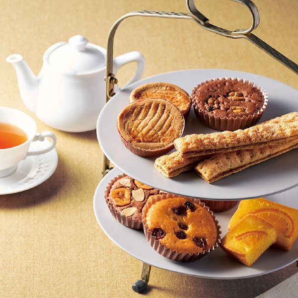 しっとり生地にフルーツやナッツを飾ったプチケーキやオレンジケーキ、さくっとした食感の中にキャラメルの風味が香る少し長いサイズのロングパイ、アーモンドが香ばしく香るフランス伝統の厚焼きクッキーと、ホテルの豊かなティータイムを演出するスイーツを詰め合わせました。