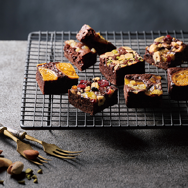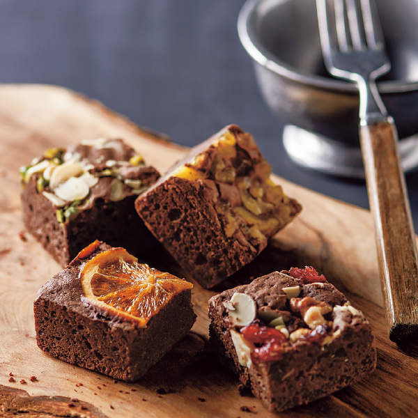 濃厚なチョコレートの生地に、香ばしいナッツや甘酸っぱいフルーツをトッピング。ピスタチオとアーモンド、ごろっとしたパイナップルやネーブル、たっぷりのドライフルーツとナッツ…。おいしさをぎゅっと詰め込んだキューブが、お口に小さなしあわせをお届けします。