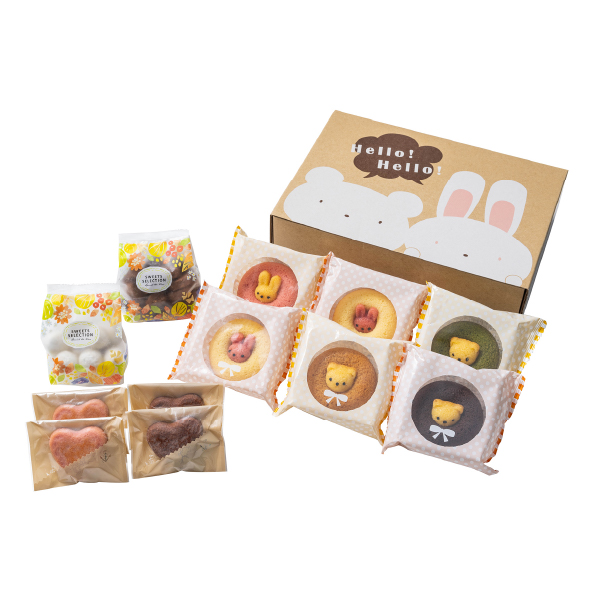 | 内容 | ハートの焼菓子(ラズベリー・チョコ×各2個)、アニマルドーナツ(うさぎプレーン・うさぎイチゴ・うさぎバナナ・くまチョコ・くま抹茶・くまキャラメル×各1個)、アーモンドボール・アーモンドココアクッキー×各1個