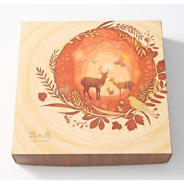 非日常の森の庭で素朴なお菓子を味わう『森の庭』シリーズ。しっとりバームクーヘンにカラメルソースをまとわせ、砂糖をかけてさらに焼き上げた「焦がしキャラメルがしみ込んだバーム」と、「しっとりバームクーヘン」の2種を詰め合わせました。ひと手間かけた味わいをお楽しみください。