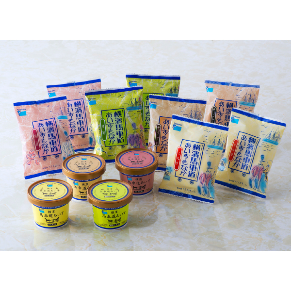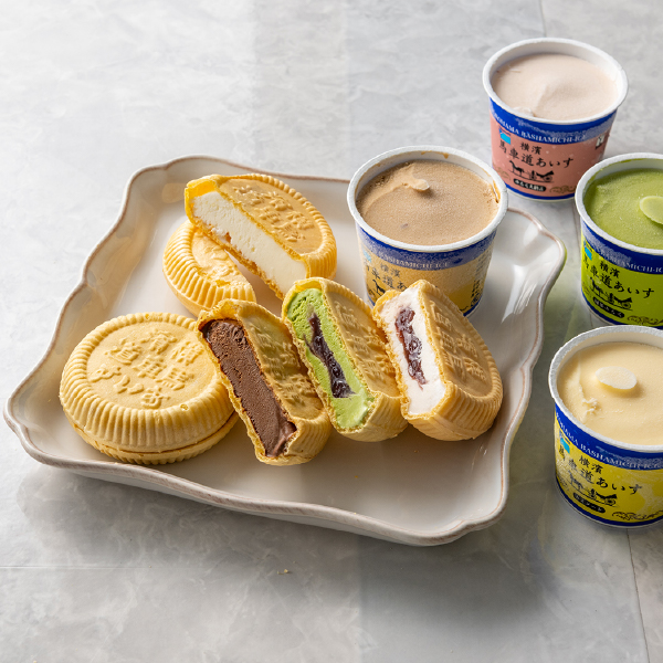 | 内容 | 横濱馬車道あいすもなか65ml(ミルク・抹茶・小豆・チョコレート×各2個)、横濱馬車道あいす110ml(カスタード・渋皮栗・みるく大納言・緑茶みるく×各1個) |