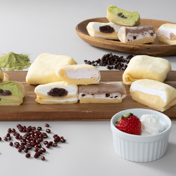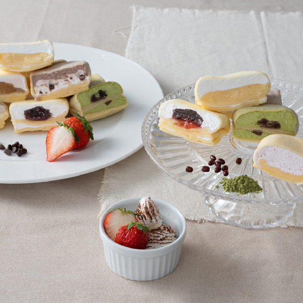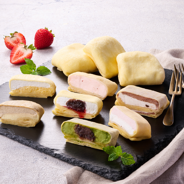 生地は和菓子屋ならではの大福のようなもちっとした食感を再現しております。その風味豊かなクレープ生地に、甘さ控えめのホイップクリームを包みました。7種類のクレープとバラエティ感のあるセット。