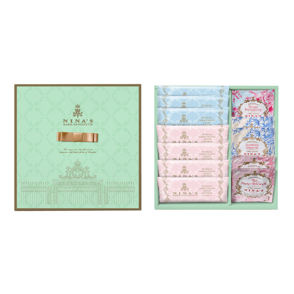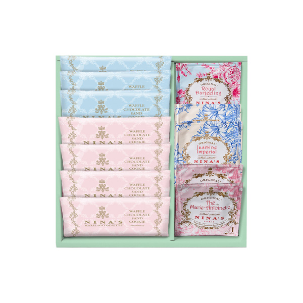 王妃マリー・アントワネットのラグジュアリー・ティーをイメージしたニナスの紅茶と、チョコレートをサンドした香ばしいワッフルクッキーをセットでお届けします。