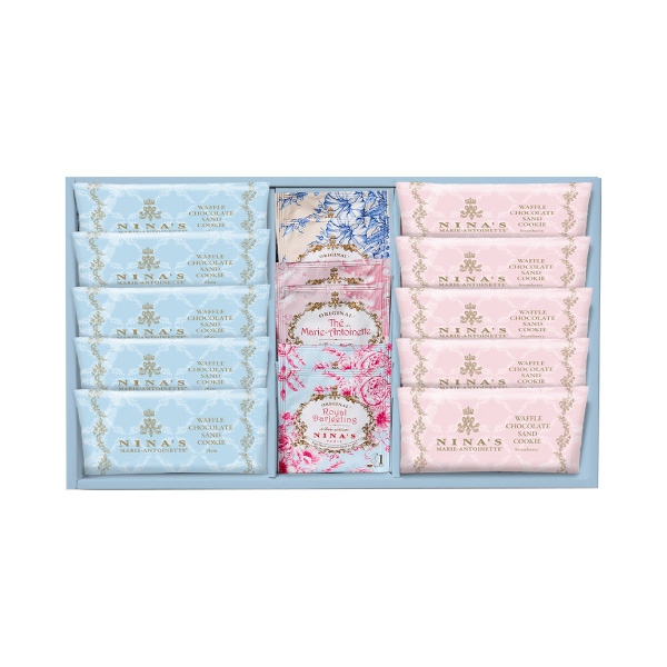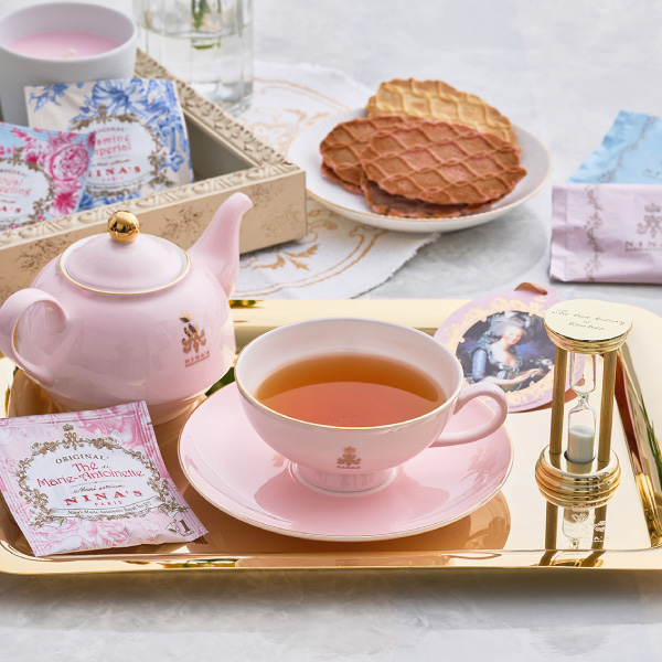 王妃マリー・アントワネットのラグジュアリー・ティーをイメージしたニナスの紅茶と、チョコレートをサンドした香ばしいワッフルクッキーをセットでお届けします。