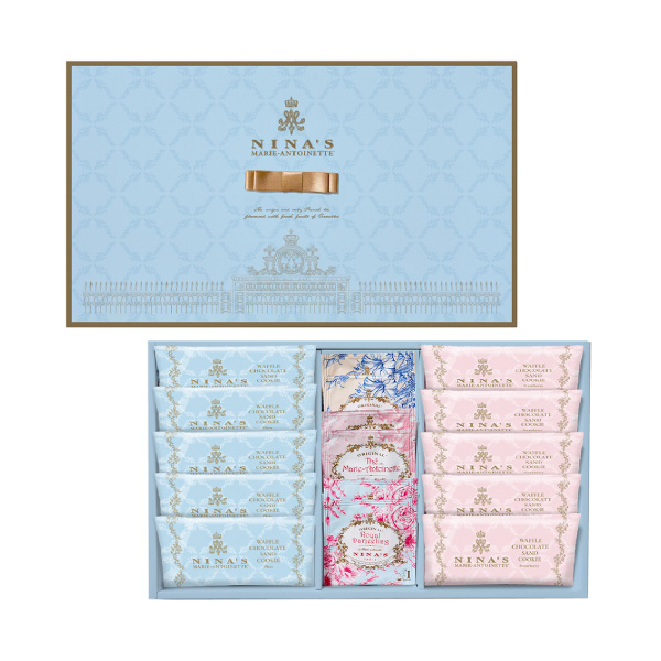 | 内容 | ロイヤル シークレット ガーデン(ニナス オリジナル マリー・アントワネット ティー・ロイヤル ダージリン・ジャスミン インペリアル×各2袋)、ワッフルチョコレートサンドクッキー(プレーン・ストロベリー×各5枚) |