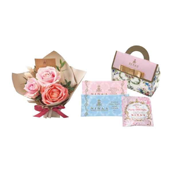 | 内容 | ミニアレンジメント スイート×1、ロイヤル シークレット ガーデン(ニナス オリジナル マリー・アントワネット ティー×1袋)、ワッフルチョコレートサンドクッキー(プレーン・ストロベリー×各1枚)、お手入れのしおり付き |