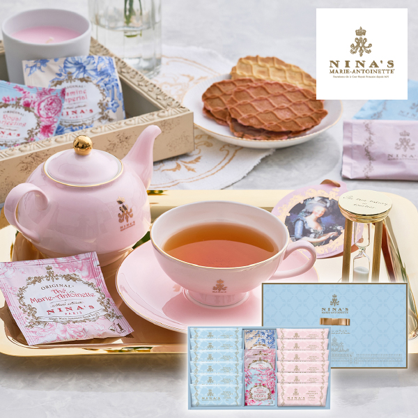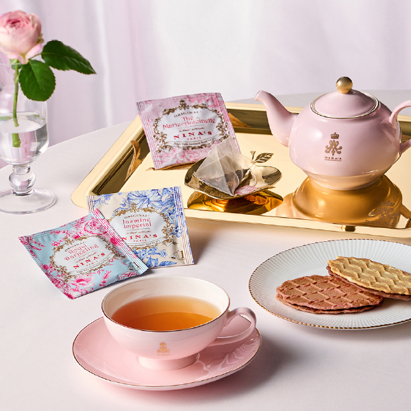 王妃マリー・アントワネットのラグジュアリー・ティーをイメージした、老舗フランス紅茶ブランド「ニナス」の紅茶と、チョコレートをサンドした香ばしいワッフルクッキーをセットでお届けします。