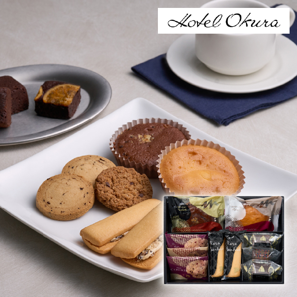 ホテルオークラの焼菓子の詰合せ。チョコレートのほろ苦さを凝縮させたブラウニー、しっとりした焼きあがりのマドレーヌなどさまざまな焼菓子を取り揃えているのにも、選ぶ、味わう楽しさを届けたいというおもてなしの心を感じて頂けるセットとなっています。