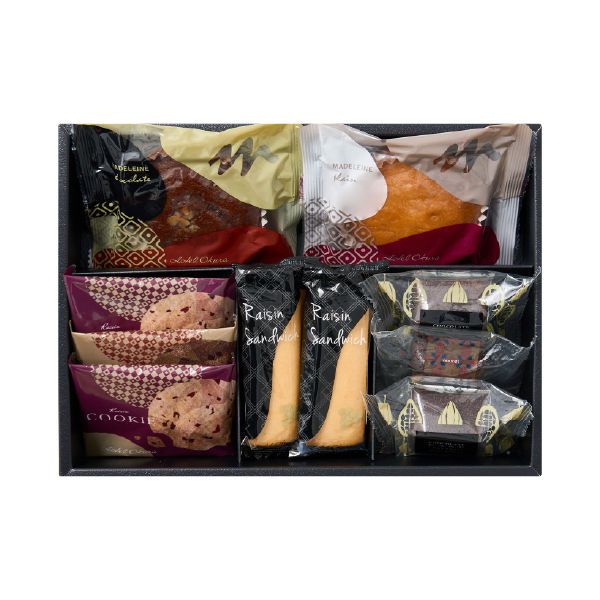 | 内容 | レーズンサンド・チョコレートケーキ・レーズンクッキー×各2個、ブラウニーネーブル・マドレーヌ(プレーン・チョコ)・チョコチップクッキー×各1個 |