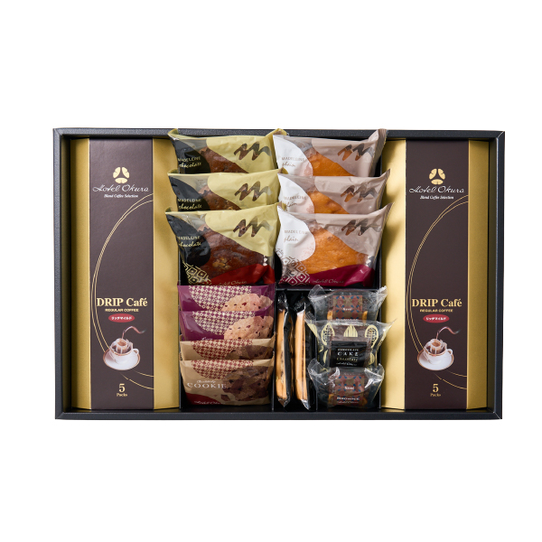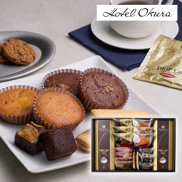 ホテルオークラの焼菓子とドリップ珈琲の詰合せ。しっとりした焼きあがりのマドレーヌやレーズンサンドなどさまざまな焼菓子を取り揃えているのにも、選ぶ、味わう楽しさを届けたいというおもてなしの心を感じて頂けるセットとなっています。焼菓子に良くあう上品な味わいのドリップ珈琲と一緒にご堪能ください。