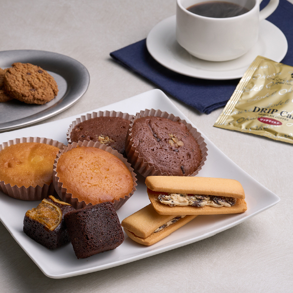 | 内容 | マドレーヌ(プレーン・チョコ)×各3個、ブラウニーネーブル・レーズンサンド・ドリップ珈琲リッチマイルド40g(8g×5袋)・レーズンクッキー・チョコチップクッキー×各2個、チョコレートケーキ×1個 |
