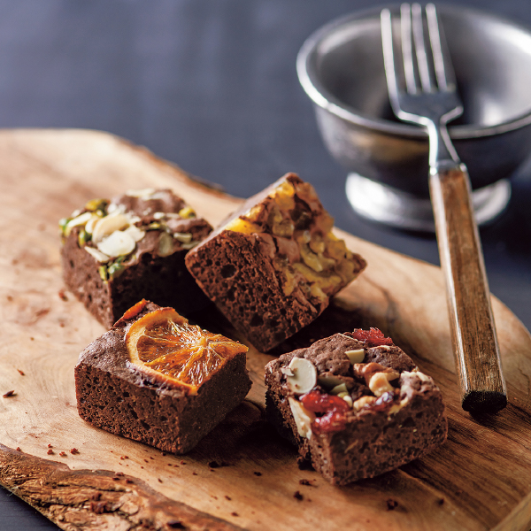 濃厚なチョコレートの生地に、香ばしいナッツや甘酸っぱいフルーツをトッピング。ピスタチオとアーモンド、ごろっとしたパイナップルやネーブル、たっぷりのドライフルーツとナッツ…。おいしさをぎゅっと詰め込んだキューブが、お口に小さなしあわせをお届けします。