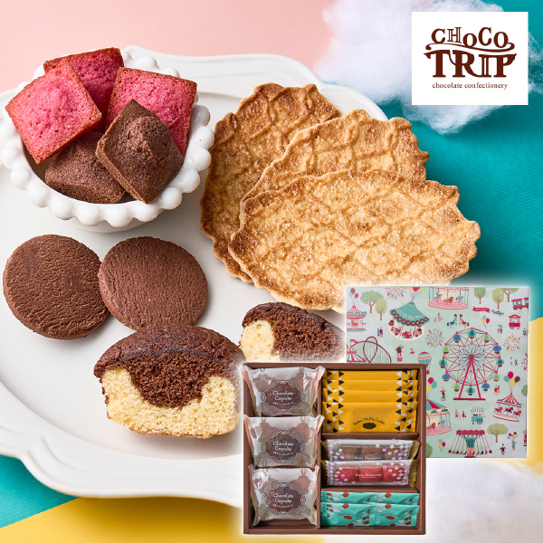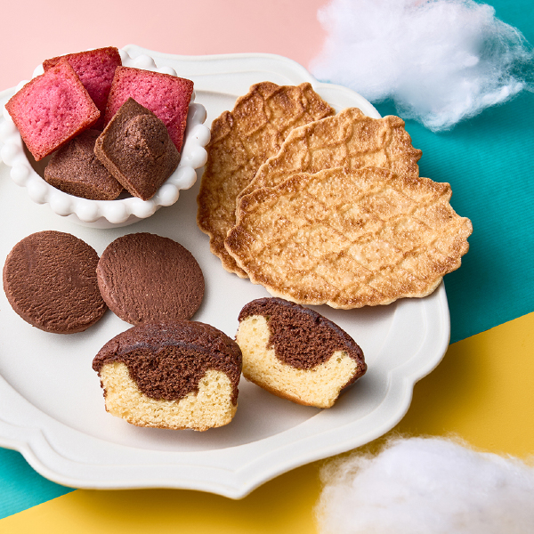 ふんわり2層のチョコカップケーキ、濃厚なチョコレートの風味が特徴の焼きショコラ、焦がしバター香るキャラメリゼされたワッフルクッキー、いろどりプチサイズのフィナンシェ。楽しさ詰まった、魅惑のお菓子たちで、笑顔の時間をプレゼントします。