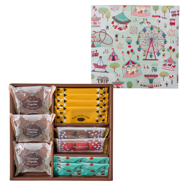 | 内容 | 2層のチョコカップケーキ×3個、焼きショコラ×4個、焦がしバターワッフルクッキー×4枚、プチフィナンシェ(ショコラ・フランボワーズ)×各1袋(3個入) |