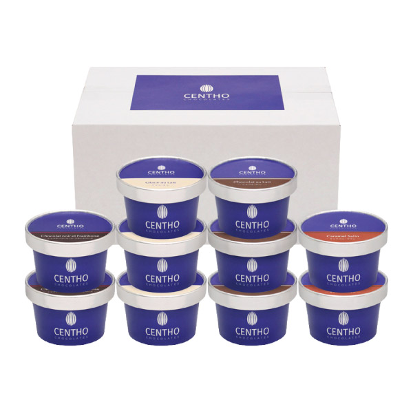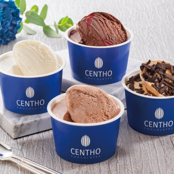 「セントー」ゲールト・デコスター氏監修のアイス。ダークチョコレートとフランボワーズ、塩キャラメルとチョコレート、ミルクチョコレート、ミルクの4種類をご用意しました。なめらかな口どけと素材の味が楽しめるアイスギフトです。