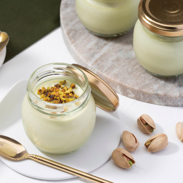 奥深いグリーンと上品なピンクの色ムラから醸し出される風味を活かしたなめらかなプリンに、ダイスクラッシュしたピスタチオをあわせて食感も楽しめるよう工夫しました。
