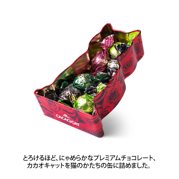 チョコレートのある至福の時間をもっと豊かになるよう想いを込めて。咲き誇るバラのパッケージは、思わず集めたくなる猫型のCACAOCAT缶にプレミアムチョコレート7種類を詰め合わせました♪メイドイン北海道のプレミアムチョコレートは、とろけだすほどのなめらかさと素材にこだわりました。猫の爪あとのように、幸せな口どけの中に感じる本物のカカオが、記憶の中に刻まれてお気に入りのチョコレートにきっとなる!猫を愛する人へ贈るギフトにぴったり。自分用にも思わず欲しくなる商品です。