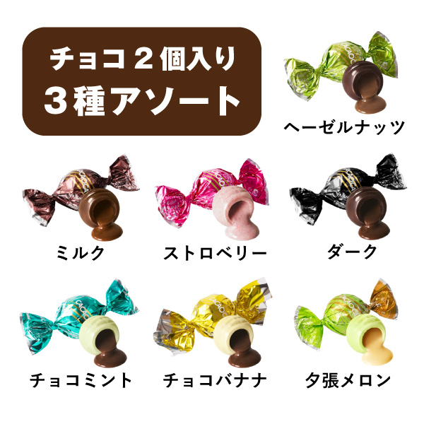 | 内容 | チョコレート(2個入り)×3 ※以下のフレーバーの中から、いずれか3種類を詰め合わせてお届けします。 (ダーク・ミルク・ストロベリー・ヘーゼルナッツ・チョコバナナ・チョコミント・夕張メロン) |