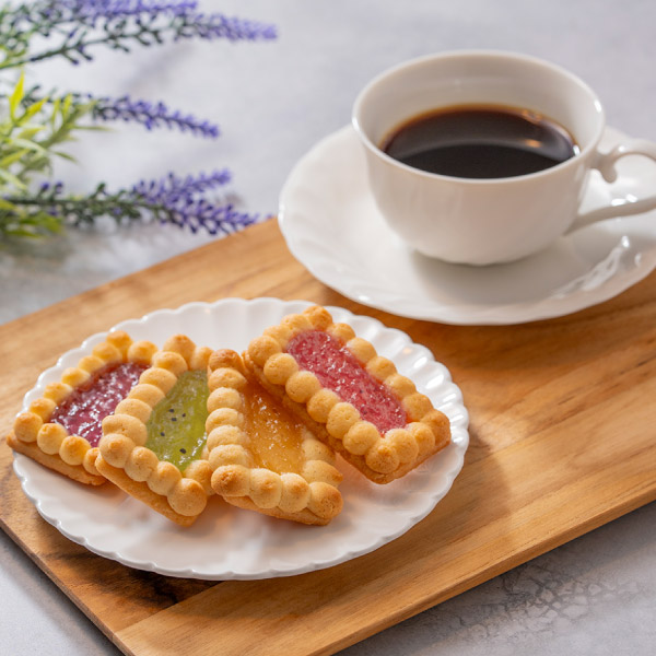 宝石のように彩り鮮やかな3種のフルーツジャムをのせ、しっとりホロッとほどける食感に焼き上げた二度焼きクッキーです。