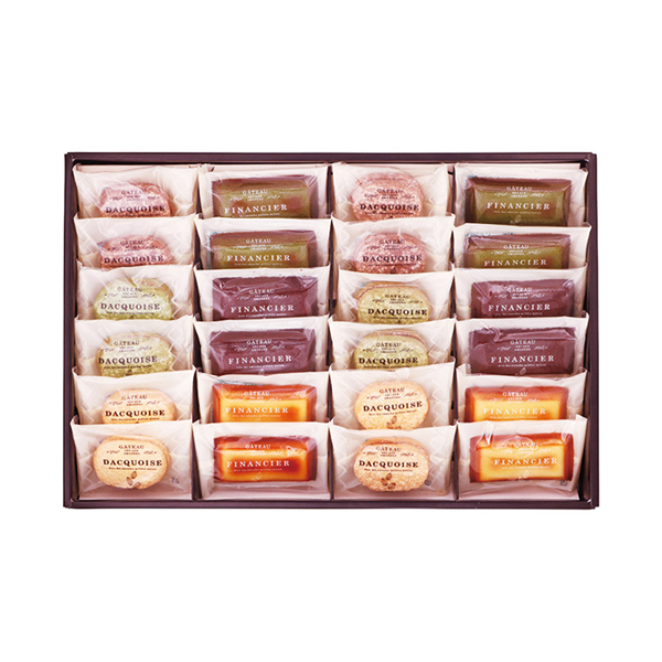 | 内容 | ダックワーズ(プラリネ・ショコラ・抹茶)・フィナンシェ(プレーン・ショコラ・抹茶)×各4 |