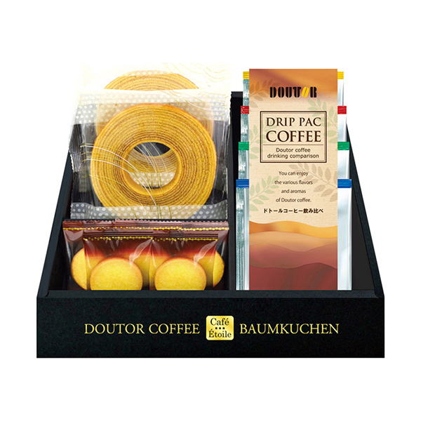 | 内容 | ミルクバウムクーヘン×2、プレーンクッキー×5、ドトールドリップコーヒー(深煎りブレンド・キリマンジャロブレンド・モカドブレンド・アロマブレンド)(7g)×各1 |