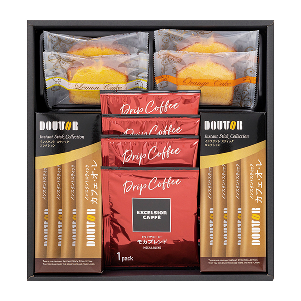 | 内容 | エクセルシオールカフェドリップコーヒー(モカブレンド8g)×4、ドトールインスタントスティックカフェオレ(9.5g×4本入)・カットケーキ(レモン・オレンジ)×各2 |