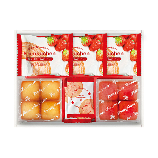 | 内容 | あまおう苺バウムクーヘン×3、焼きほろろクッキー(イチゴ)×2、プチフィナンシェ4個入(あまおう苺・プレーン)×各1 |