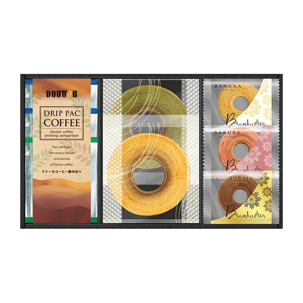 | 内容 | ミルクバウムクーヘン・宇治抹茶バウムクーヘン・ドトールドリップコーヒー(キリマンジャロブレンド7g)・ミニバウムクーヘン(バナナ・桜・ベルギーショコラ)×各1、ドトールドリップコーヒー(深煎りブレンド7g)×2 |