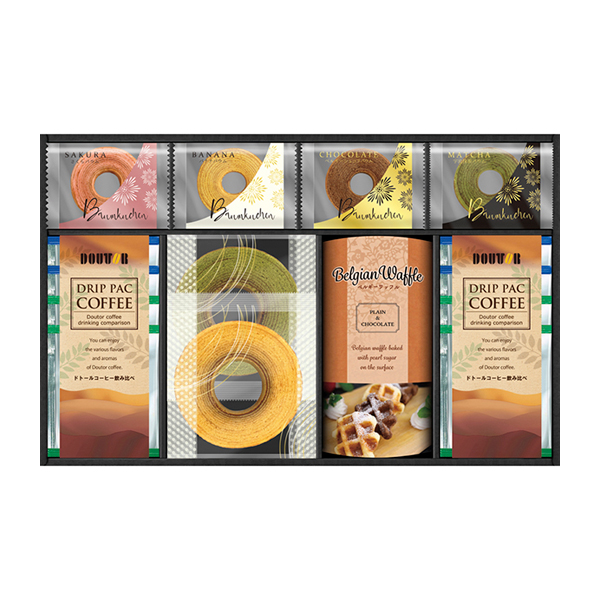 | 内容 | ミルクバウムクーヘン・宇治抹茶バウムクーヘン・ミニバウムクーヘン(バナナ・桜・ベルギーショコラ・宇治抹茶)・ベルギーワッフル(ショコラ)×各1、ドトールドリップコーヒー(深煎りブレンド7g・キリマンジャロブレンド7g)×各4、ベルギーワッフル(プレーン)×2 |