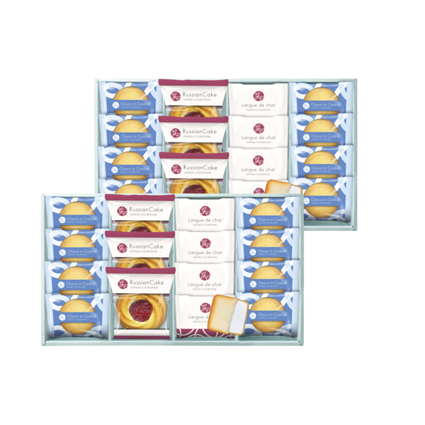 | 内容 | ロシアケーキブルーベリーサン×6、ラングドシャ×8、チョコインクッキー×16 |