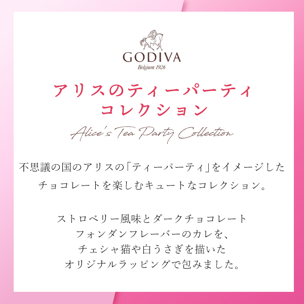 「不思議の国のアリス」の印象的なシーン「ティーパーティ」をイメージしたチョコレートを楽しめる、キュートな「アリスのティーパーティ コレクション」。 ストロベリー風味のミルクチョコレートとダークチョコレートフォンダンフレーバーのカレを、チェシャ猫や白うさぎを描いたオリジナルのラッピングで包みました。