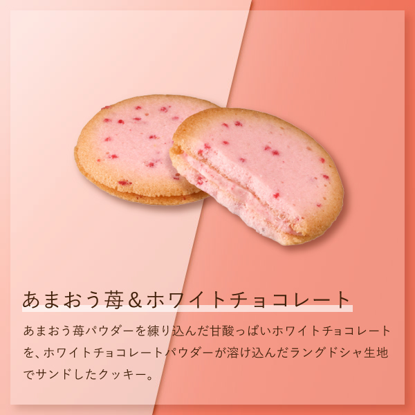「あまおう苺&ホワイトチョコレート」を4枚詰めました。ラングドシャのサクッとした口あたりと、風味豊かなチョコレートのハーモニーをお楽しみください。※福岡県産あまおう苺58%使用(苺中)