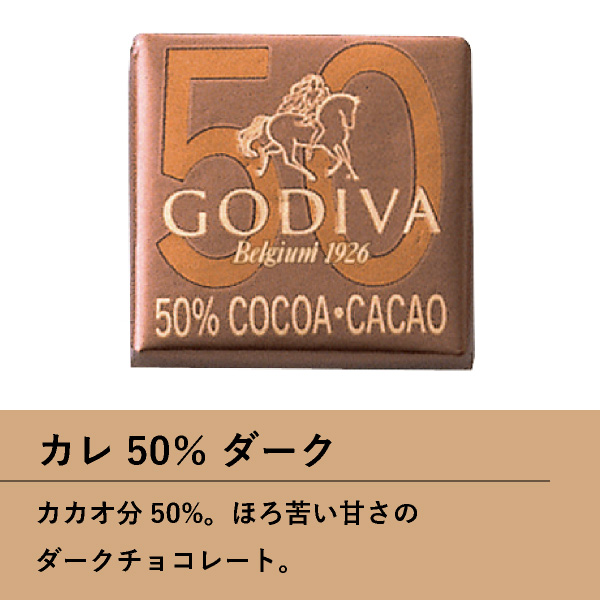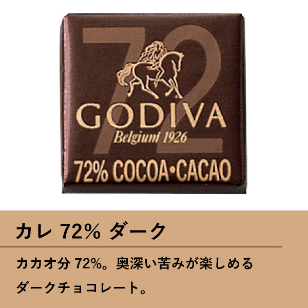 | 内容 | カレホワイト4枚、カレミルク4枚、カレ50%ダーク4枚、カレ72%ダーク4枚、カレルビー4枚 |