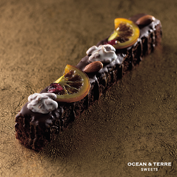 キャラメリゼしたアーモンド、ホワイトチョココーティングしたクルミ、ローストしたオレンジがアクセント。オレンジの薫り立つ、こだわり抜いたショコラケーキ。