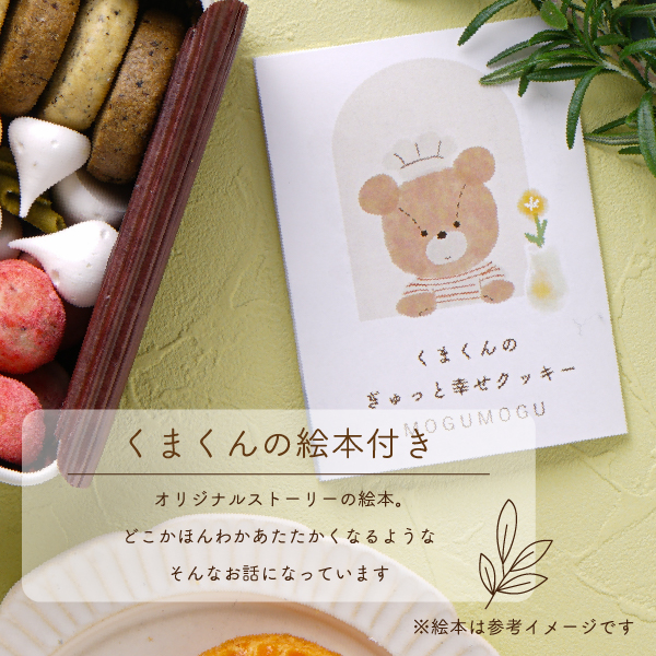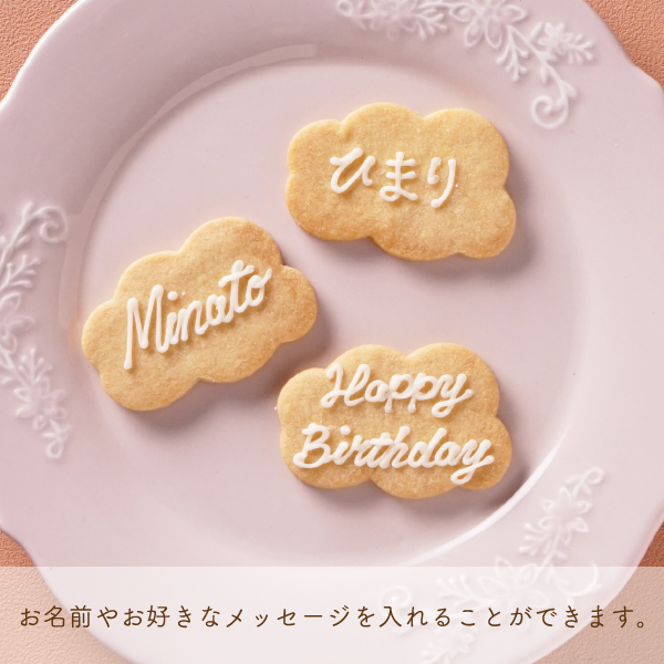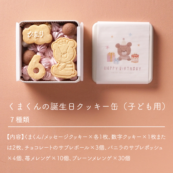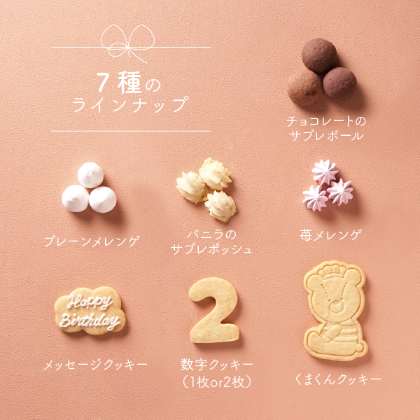 | 内容 | くまくんクッキー、メッセージクッキー×各1枚、数字クッキー×1枚または2枚、チョコレートのサブレボール×3個、バニラのサブレポッシュ×4個、苺メレンゲ×10個、プレーンメレンゲ×30個 |
