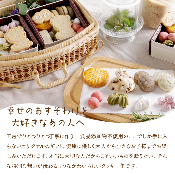 一度食べたら忘れられない、特別な想いが伝わるクッキー缶。食品添加物不使用で体に優しく、国内外から選び抜いた素材の美味しさがぎゅっと詰まっています。