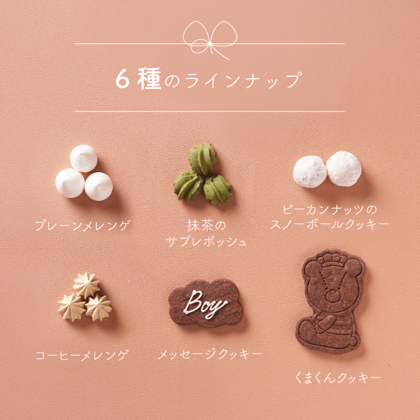 | 内容 | くまくんクッキー、メッセージクッキー×各1枚、抹茶のサブレポッシュ×4個、コーヒーメレンゲ×10個、ピーカンナッツのスノーボールクッキー×4個、プレーンメレンゲ×30個 |