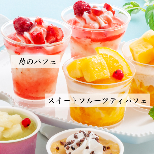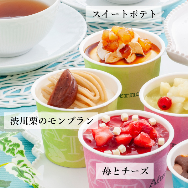 | 内容 | 苺のパフェ80ml・スイートフルーツティーパフェ82ml×各2、渋皮栗のモンブラン94ml×1、洋梨とアールグレイ・苺とチーズ・スイートポテト・チョコバナナ・ダブルチョコレート各103ml×各1(計10) |