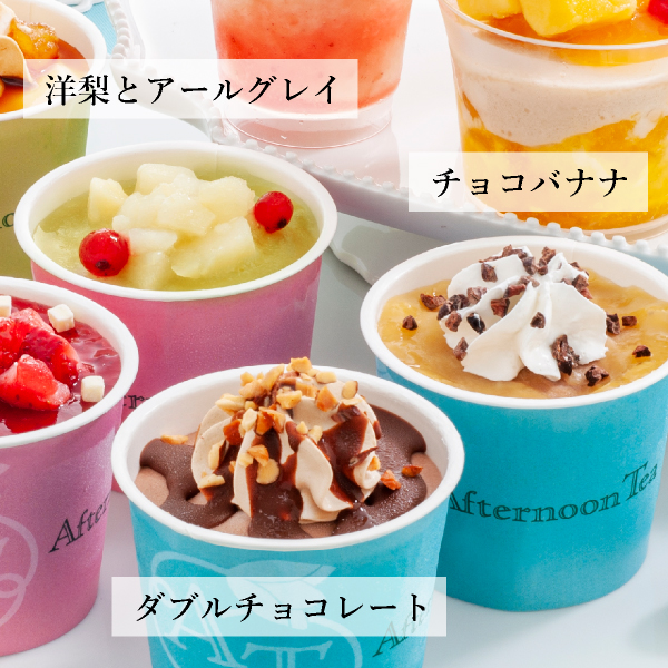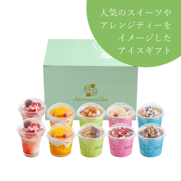 全国に店舗を展開する「アフタヌーンティー・ティールーム」の華やかなアイスギフト。店舗で人気のスイーツメニューやアレンジティーをイメージした8種類の詰合せです。