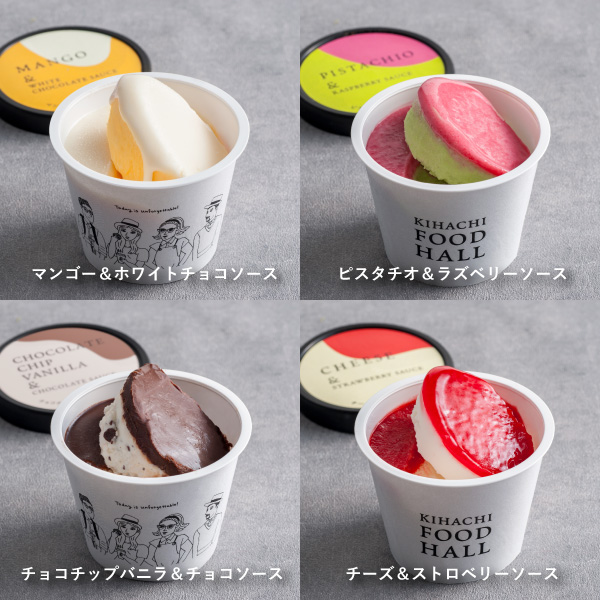 北海道の生クリームを使ったアイスとチョコやフルーツソースの相性を楽しめる2層仕立てのアイスクリーム。素材そのもののおいしさを引き出すKIHACHIならではのアイスギフトです。