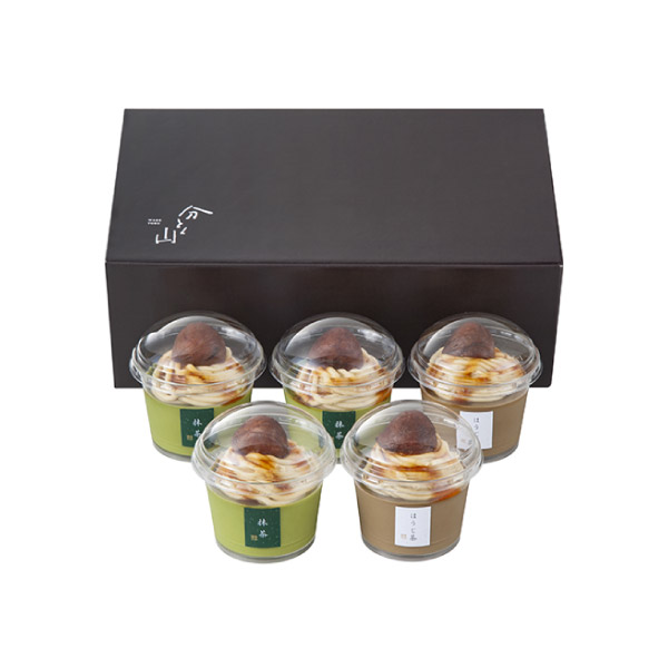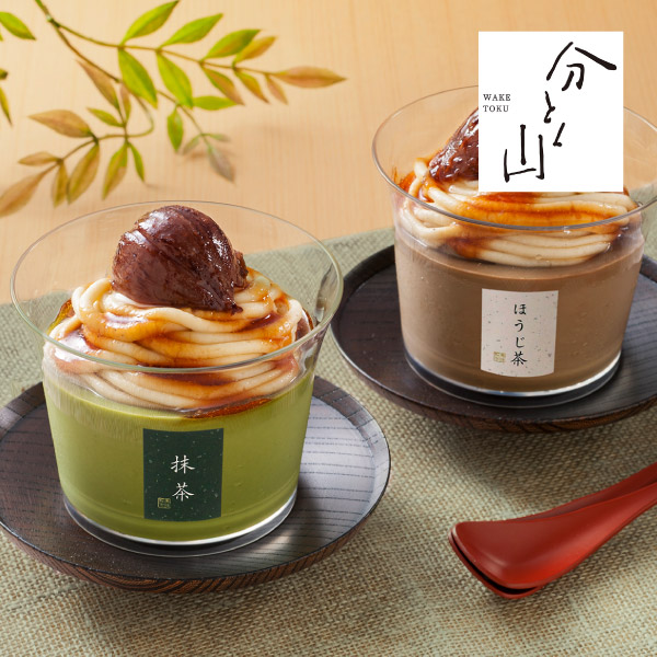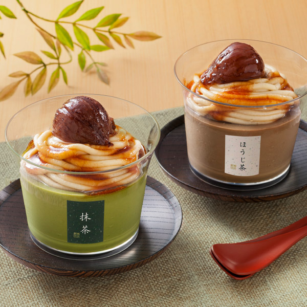 ほろ苦い香り豊かな抹茶プリンとまろやかで香ばしさが香るほうじ茶プリン。2種のプリンの上にモンブランクリームを絞り、栗をトッピング。温かい飲み物とご一緒にティータイムをお楽しみください。