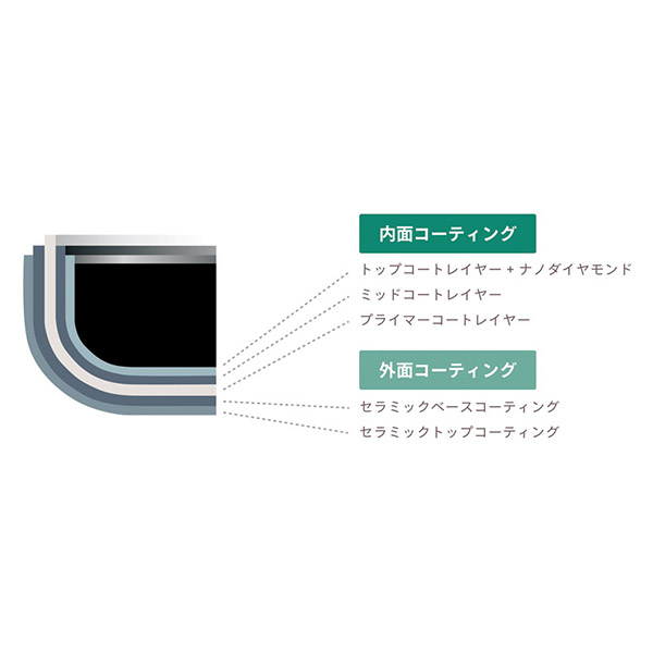 | 材質 | アルミニウム合金(鉄粉溶射・内面:ダイヤモンドコート加工・外面:セラミックコート加工)・PF |