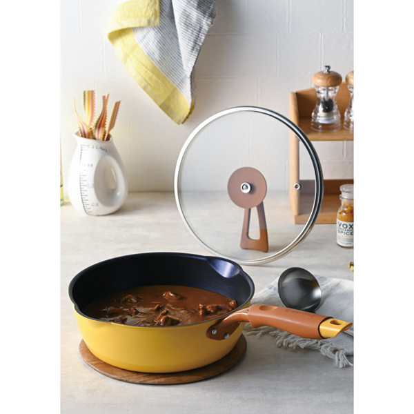 炒めから煮込みまでこれ一つで完結できる深型フライパン。自立できる便利なガラス蓋と、カレーや副菜が楽しめるオリジナルレシピ付きで、日々の食卓をもっと楽しく彩ります。料理好きの方への上質な贈り物として喜ばれる実用的な一品です。