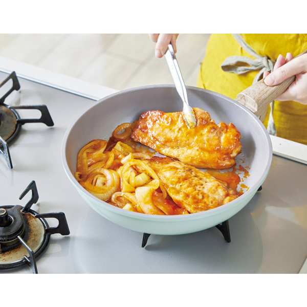 さわやかなくすみグリーンで、キッチンを鮮やかに彩ります。こびりつきにくいダイヤモンドコート加工。接合部分にリベット(留め具)がない為、洗いやすいです。軽量なアルミダイカストを採用。強度に優れ、熱伝導率が高いため、素早く調理できます。PFOA・PFOS不使用。レシピブック付。