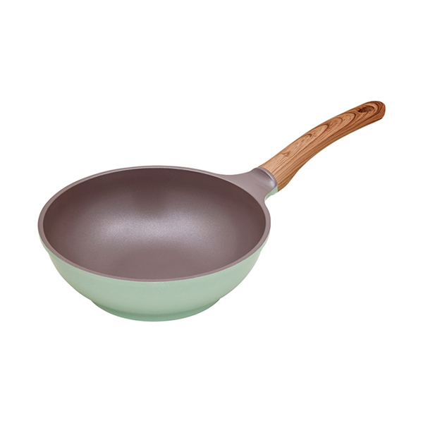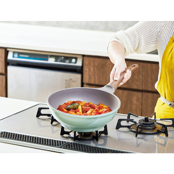 さわやかなくすみグリーンで、キッチンを鮮やかに彩ります。こびりつきにくいダイヤモンドコート加工。接合部分にリベット(留め具)がない為、洗いやすいです。軽量なアルミダイカストを採用。強度に優れ、熱伝導率が高いため、素早く調理できます。PFOA・PFOS不使用。レシピブック付。